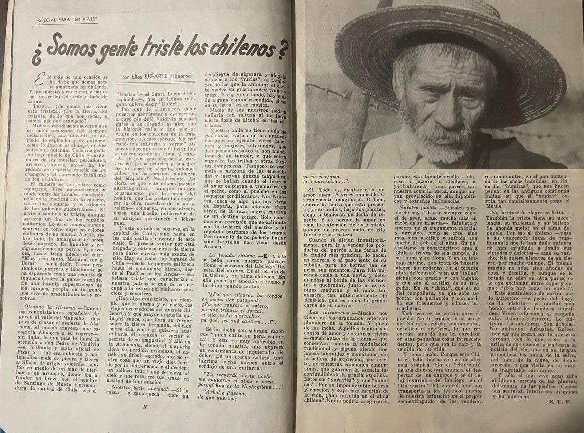 Si siguen las entradas de este blog reconocerán mi afición por las revistas viejas. Hace poco me hice de un lote de revistas “En Viaje” de finales de los años 50 y encontré este artículo que llamó mi atención. Puedo hacer la salvedad de que hay muchas cosas que me parecen fuera de lugar o estereotipos en este texto, sin embargo me interesa siempre el tópico de la tristeza del chileno, razón por la cual comparto este texto en su totalidad.